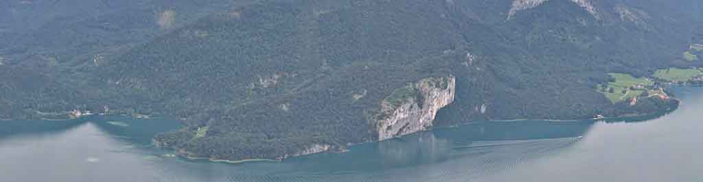 Beschreibung : Von diesem Punkt ist praktisch der gesamte Wolfgangsee zu sehen. Hinter dem Wolfgangsee ragt der Schafberg empor. Links am Bildrand liegt St. Gilgen, dahinter klein der Krottensee und der Mondsee.